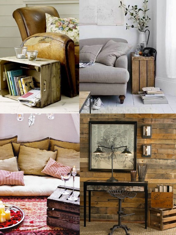 Petiscos, inspiração para reaproveitar não vai faltar. Acima, as caixas de frutas de feira se transformam em mesinhas laterais, revisteiro e até armário. e abaixo, os Pallets são incorporados na decoração de maneira sensacional, ora como sofá, ora como estante ou mesa.